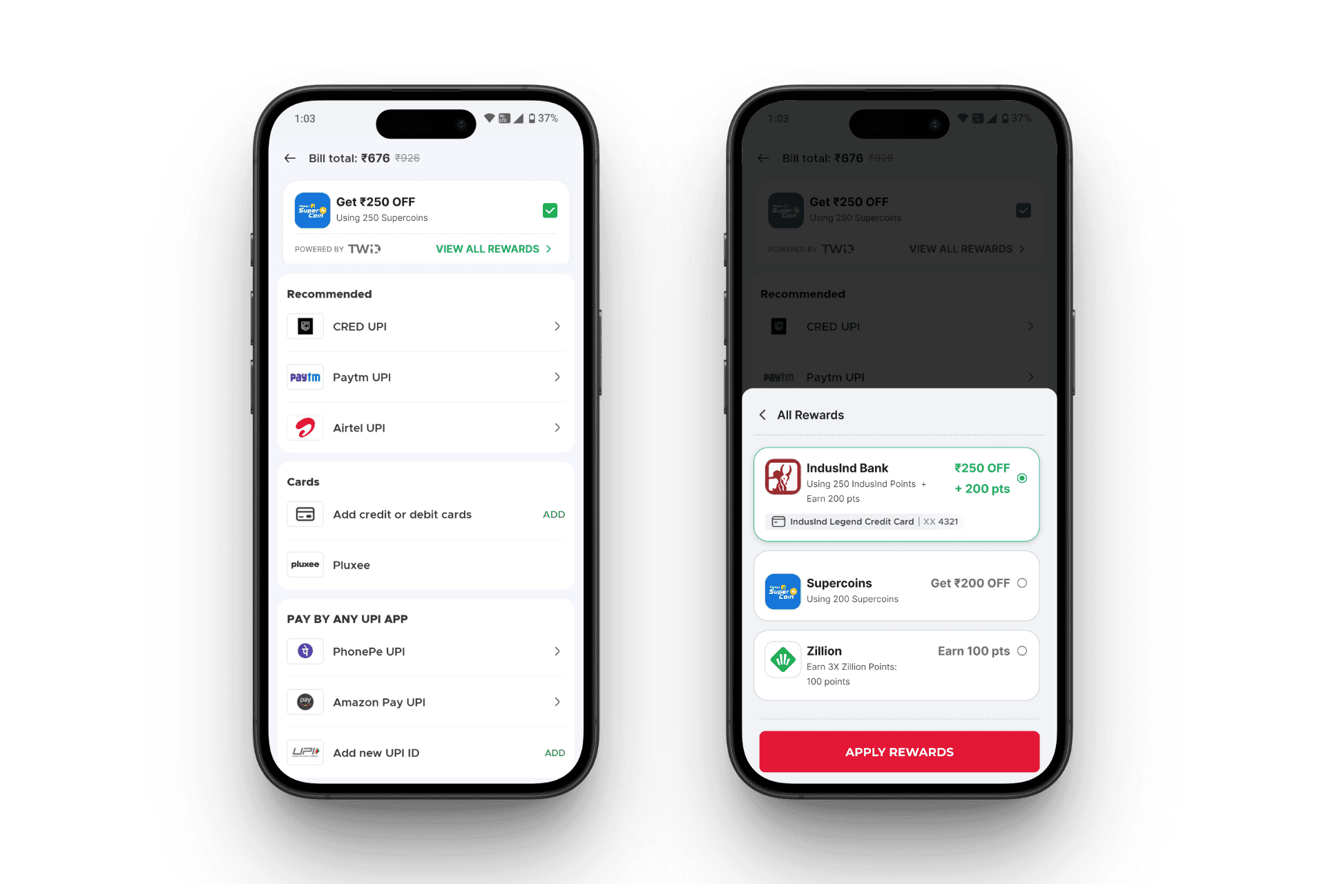 Crafted the entire redemption experience at checkout, including eligibility logic and real-time point detection. Designed a frictionless interface that made “Pay with Rewards” feel as seamless as cash or UPI.